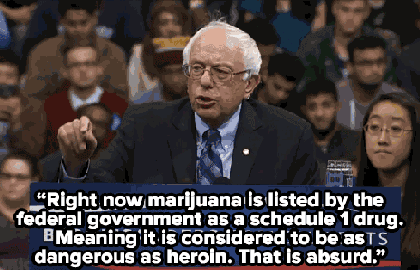 美国纽约当地时间周三,民主党候选人伯尼·桑德斯在弗吉尼亚州的乔治梅森大学举行演讲。他表示,目前美国还将大麻列在违禁药品名单内,与海洛因属同一危险级别,这种做法是荒谬的。