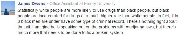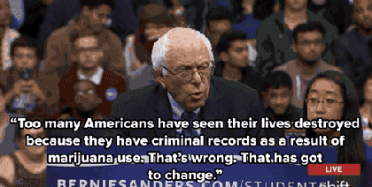 “数据显示,白人嗑药人数比黑人更多,但黑人因毒品被捕的几率却比白人高得多,每三名黑人中就有一人有犯罪记录,这显然说不通。我很高兴伯尼提出了大麻合法化的建议,这个体制需要修改的地方还有很多。”
