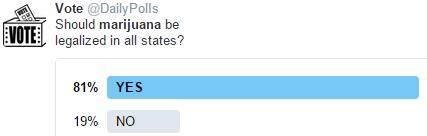 桑德斯的观点在年轻人中得到了相当高的呼声,线上投票显示,至少在twitter用户眼中,大麻合法化是民之所向。