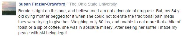 “伯尼是对的,我虽然不是瘾君子,但祖母84岁了,她无法忍受传统治疗方式造成的痛苦。她所受的苦难让我坚信大麻应该合法化。”