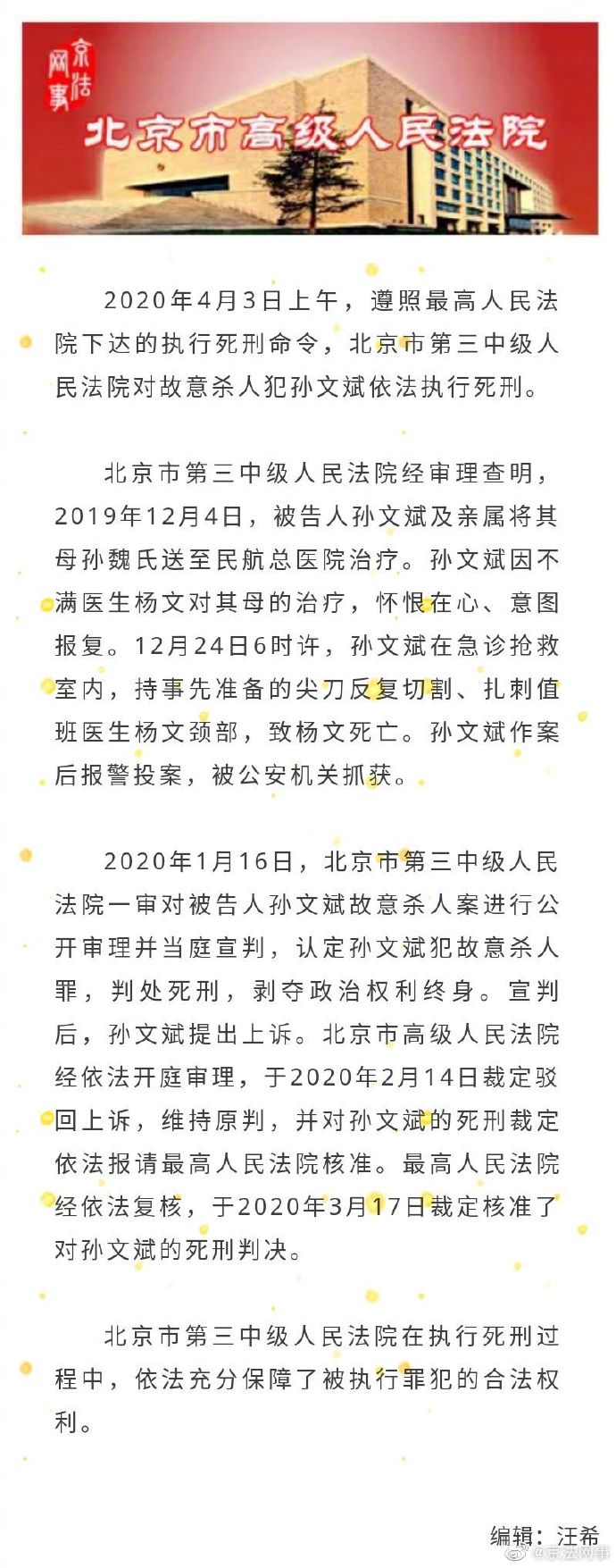 2020年4月3日上午,遵照最高人民法院下达的执行死刑命令,北京市第三中级人民法院对故意杀人犯孙文斌依法执行死刑。