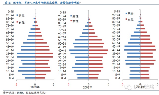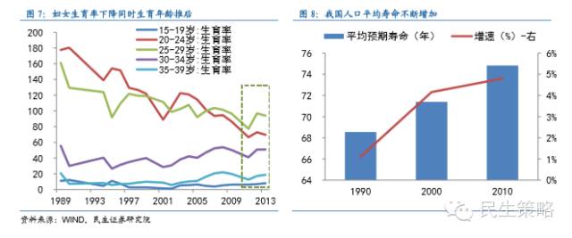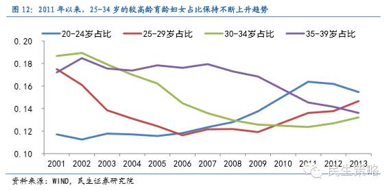 但2005年以后新增人口没有上升反而下降,我们认为这主要与生育年龄的推后有关,自1990年代起,20-24岁妇女生育率显著持续下降,25-29岁生育率在2006年起成为妇女最集中生育的年龄,同时30-34岁生育率自2001起持续上涨,晚育是造成第四次“婴儿潮”没有出现的主要原因。晚育我们认为主要是由于生活成本上升、婚育观念的转变造成的晚婚和生育年龄的推后。