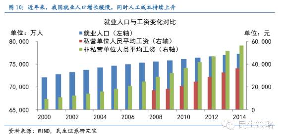 劳动力供应不足将推动人工成本的上升,这主要体现在近年来我国就业人口增长缓慢同时员工工资保持相对较高速增长。劳动力供应不足、人工成本上升都不利于我国经济增长,因为这将限制企业规模的增长、侵蚀企业利润,未来老龄化加速,这两种现象将更加凸出,从而进一步限制经济增长。