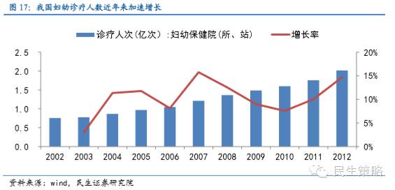 产前:重点关注孕妇检测、辅助生殖服务、孕妇用药。在生产前,为保证顺利生产,孕妇及胎儿检测、孕妇身体的健康将成为家庭关注的重点。2010年以来,我国妇幼保健所诊疗人次加速上涨,增速由7.6%增长至14.7%,在新增人口明显明显增长的背景下,诊疗人次的增加,显示出家庭对孕妇、婴儿健康关注度的提高。