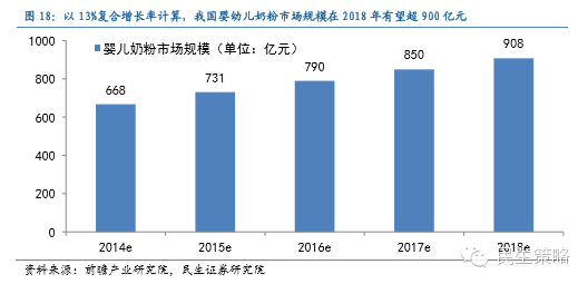 根据前瞻产业研究院发布的《2015-2020年中国奶粉行业市场调研与投资预测分析报告》数据显示,2013年,我国婴幼儿奶粉市场规模约为600亿元,随着我国第四个人口小高峰来临,以13%的复合增长率测算,2018年,婴幼儿奶粉市场规模将增长至900亿元。