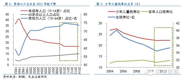 低出生率及人口老龄化令人口红利逐渐消失。支撑人口红利的两大要素,高劳动人口占比、低抚养率分别在2010年、2011年出现拐点,即劳动人口占比降低、抚养率提高。
