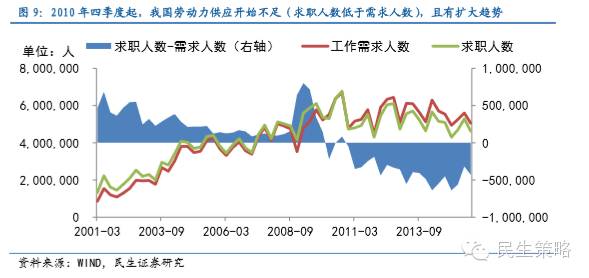 老龄人口加速增长、新生人口低速增长造成劳动力供应紧张,人工成本上升。老龄人口增多及新生人口增长缓慢造成的最直接结果是适龄劳动人口的下降,劳动力供给趋紧,自2010年起,我国已出现劳动力供应不足现象即求职人数低于需求人数,并且有扩大的趋势。