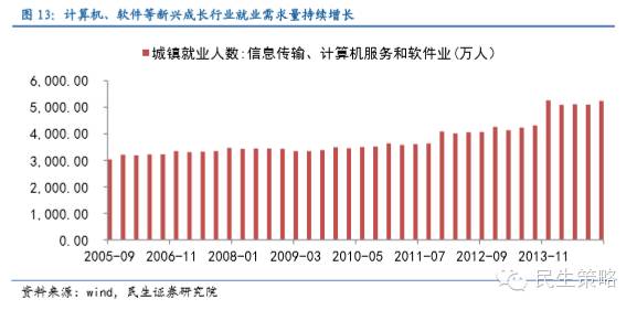 因为我们预计未来经济增长将依赖产业升级转型及消费服务业大发展,产业升级及消费服务业发展需要年轻、高素质的劳动力供给,以计算机行业为例,近年来,就业人数持续增长,表明劳动力需求大。