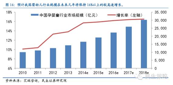 据艾瑞咨询预测,在“单独二胎”政策下,2014至2018年,婴幼儿行业市场规模将由1.65万亿增长至3.02万亿,年均增长率约为16%,高于此前约12%的增速,因此二胎政策若全面放开,婴幼儿市场规模将进一步高速增长。