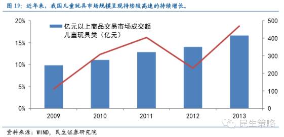 幼儿:重点关注童装、玩具、动漫。在幼儿时期,由于年龄的增长,对服装、娱乐的需求将增加,娱乐的方式具体有玩具、动漫等。近年来,儿童玩具市场成交额稳定增长,2013年市场成交额达到415.27亿元,年增长率18.75%,相较2010年增长50.57%,未来随着儿童数量的增加,玩具市场的交易额有望持续保持较高速地增长。