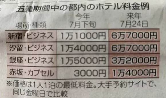 据当地媒体报道,在新宿,2019年7月下旬1.1万日元的房间,2020年7月24日的价格是6.7万日元,汐留从1.4万日元升至6.7万日元,银座从1.5万日元涨到3.2万日元,赤坂从3000日元涨至1.4万日元。