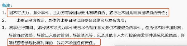 部分购买套餐的游客担心产品无法全额退款——凯撒的合同条款显示,因不可抗力因素导致比赛取消,或因突发事件影响比赛时间,该公司不承担任何责任。