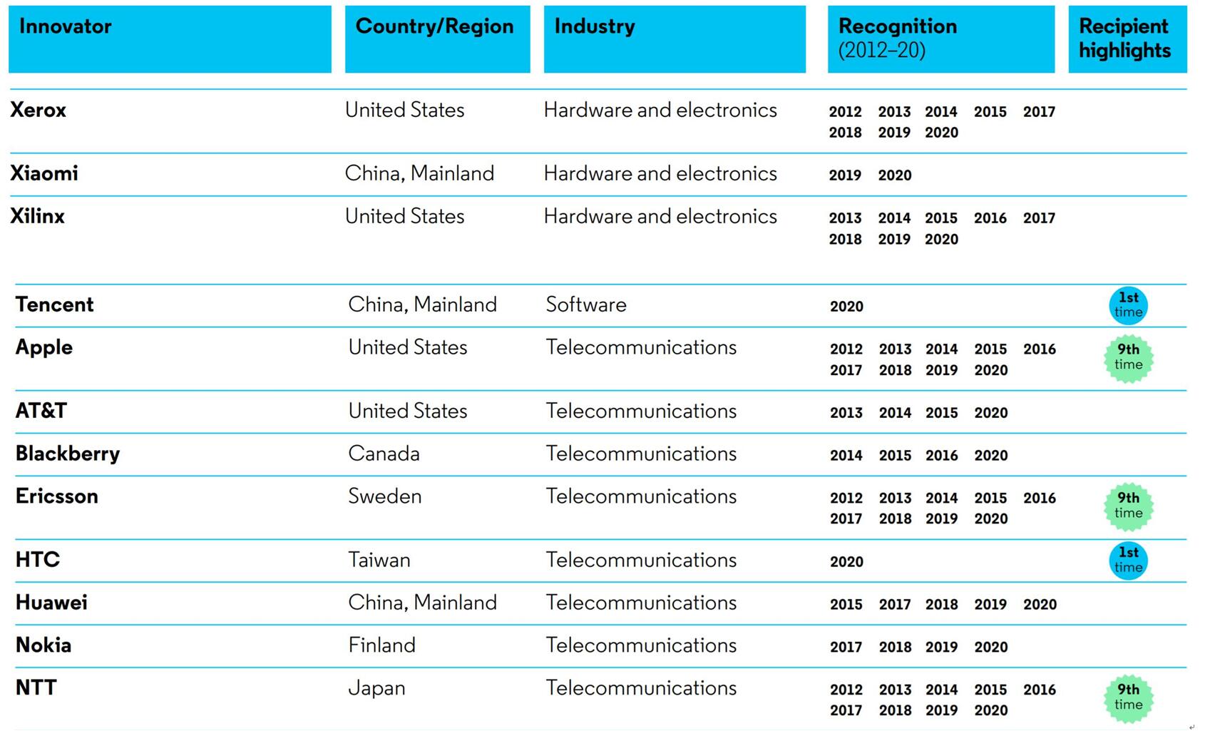 据来自美国学术和专利信息调查咨询企业Clarivate Analytics最新发布的根据所拥有专利价值评出的全球最具创新力的100家企业和研究机构榜单显示,中国仅有3家企业上榜,其中除了华为,就有小米(以下图片为100家名单截选)。