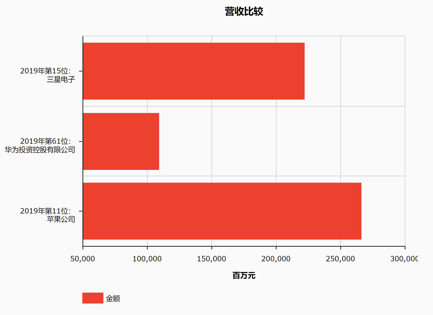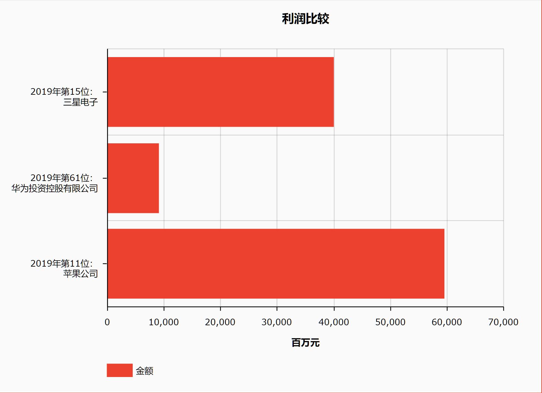 为了更形象地展现华为在营收、利润与苹果和三星的差距,我们截取了去年《财富》杂志世界500强排名中华为、三星和苹果在排位、营收、利润上的对比图,需要说明的是,这个排名是基于2018年的财务数据,2020年的排名未出,但鉴于2019年各自的业绩,整体趋势应该不会发生太大的变化。