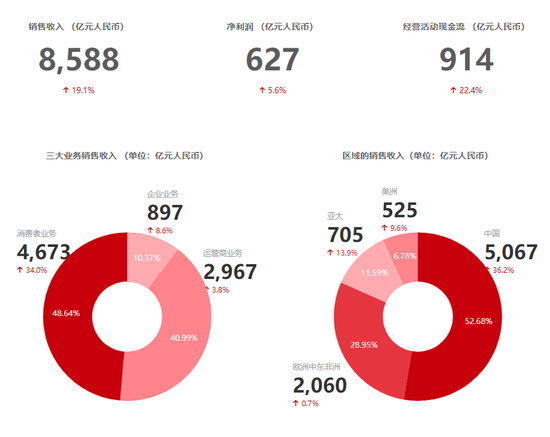 得益于研发上的超强投入,华为的营收和利润也创历史新高。其中营收达到8588亿元,净利润627亿元,净利润率为7.3%,经营活动现金流914亿元,销售成本是5361亿元。