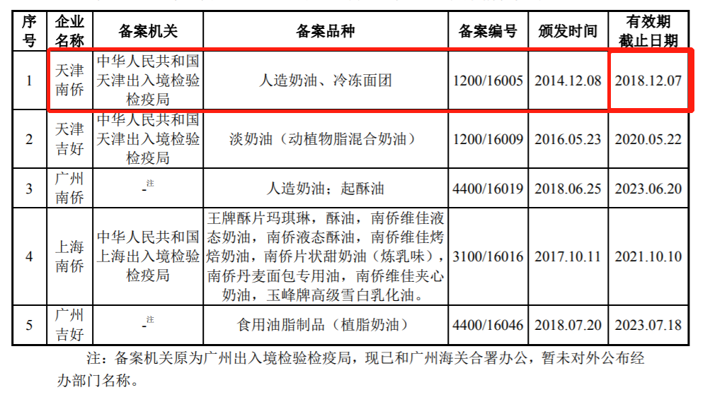 招股书显示,南侨股份旗下的天津南侨“人造奶油、冷冻面团”出口备案有效期截止时间是2018年12月7日,在公司2018年12月19日递交招股书时,已经过期。既然过期,不去续上再来拟IPO,这是想干什么?是要拿着这样的招股书考察发审委人员的“眼力”吗?该公司后续备案情况如何?