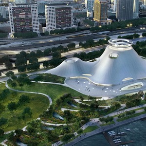 从外观上看,MAD设计的美术馆将会是一个拥有两个顶点的白色帐篷。而内部功能的设置,除了主体的美术馆,两顶点中较高的一个将会有一个环形观景台以及360度全景餐厅,旨在为参观者提供更多元的体验。同时,MAD还请了芝加哥本土事务所Studio Gang为美术馆与人工半岛Northly Island之间设计连接桥梁,还找来了纽约事务所SCAPE担任景观设计。整体建筑计划预计花费4亿美金。