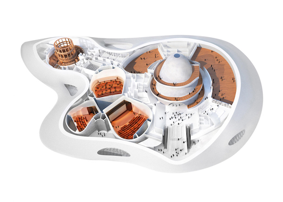 所以,在2015年9月的时候,马岩松带领团队修改了原来的方案,将整体建筑面积收缩了40%。其中整个建筑主体的占地面积减少了25%至27870平方米,而公共面积增加了1.82公顷,为周边居民提供更大面积的跑步道和行人通道。