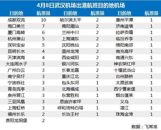 从目的地来看,从武汉飞往成都的航班最多,达10班;海南省(海口及三亚)也有10班,广东地区机场总计13班。