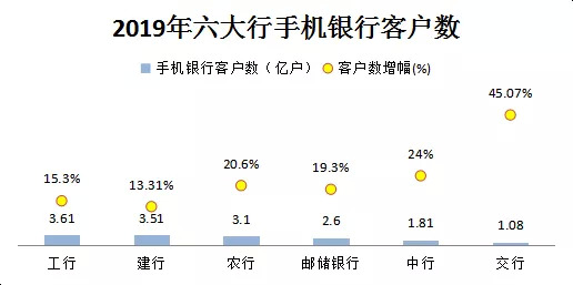 交行手机银行运营提速最快。2018年底,交行公布的手机银行注册量为7414万户,年交易量为11万亿,手机银行交易笔数3.70亿笔。2019年,交通银行年报披露手机银行客户数较上年末增长45.07%,增幅最高;交易笔数、交易金额同比分别增长30.27%、18.45%。月活跃客户(MAU)达 2,218.24万户,较年初增长36.44%。