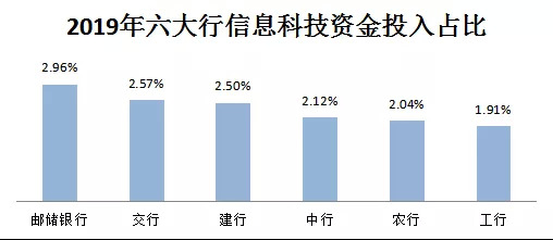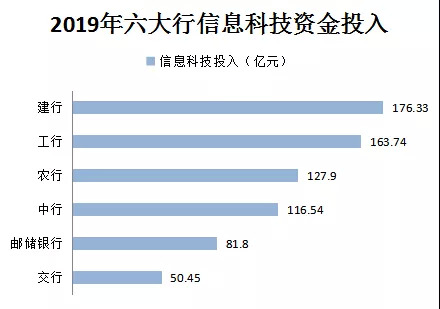 今年六大行都公布了信息科技投入,银行IT市场规模显著扩张。据统计2019年,六大行总共投入716.76亿元在信息科技上。其中,建行金融科技投入资金最多,为176.33亿元;而邮储银行信息科技投入占营收比例最大,为2.96%。未来银行业的发展方向是小前台、大中台的轻型银行,随着金融IT化程度越高,银行将迎来数字化转型提速的黄金时期。