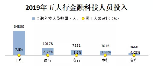 2019年,建设银行联手腾讯共建金融科技联合创新实验室,加速金融科技创新战略;搭建金融科技创新服务云平台,并且在行内将科技部门独立出来,加快技术敏捷的脚步。截止2019年末,建行信息技术开发与运营人员为2.77万人,占全行员工中的7.99%。