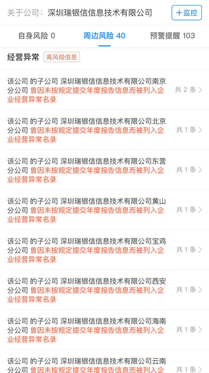 从天眼查信息显示,深圳瑞银信信息技术有限公司曾多次因未按规定提交年度报告信息而被列入企业经营异常名录。