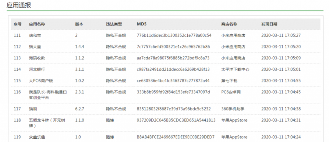 从2020年1月份至2020年4月7日,国家移动互联网应用安全管理中心(CNAAC)3月通报了306款违规APP,其中赌博及隐私权限不合规占主流。