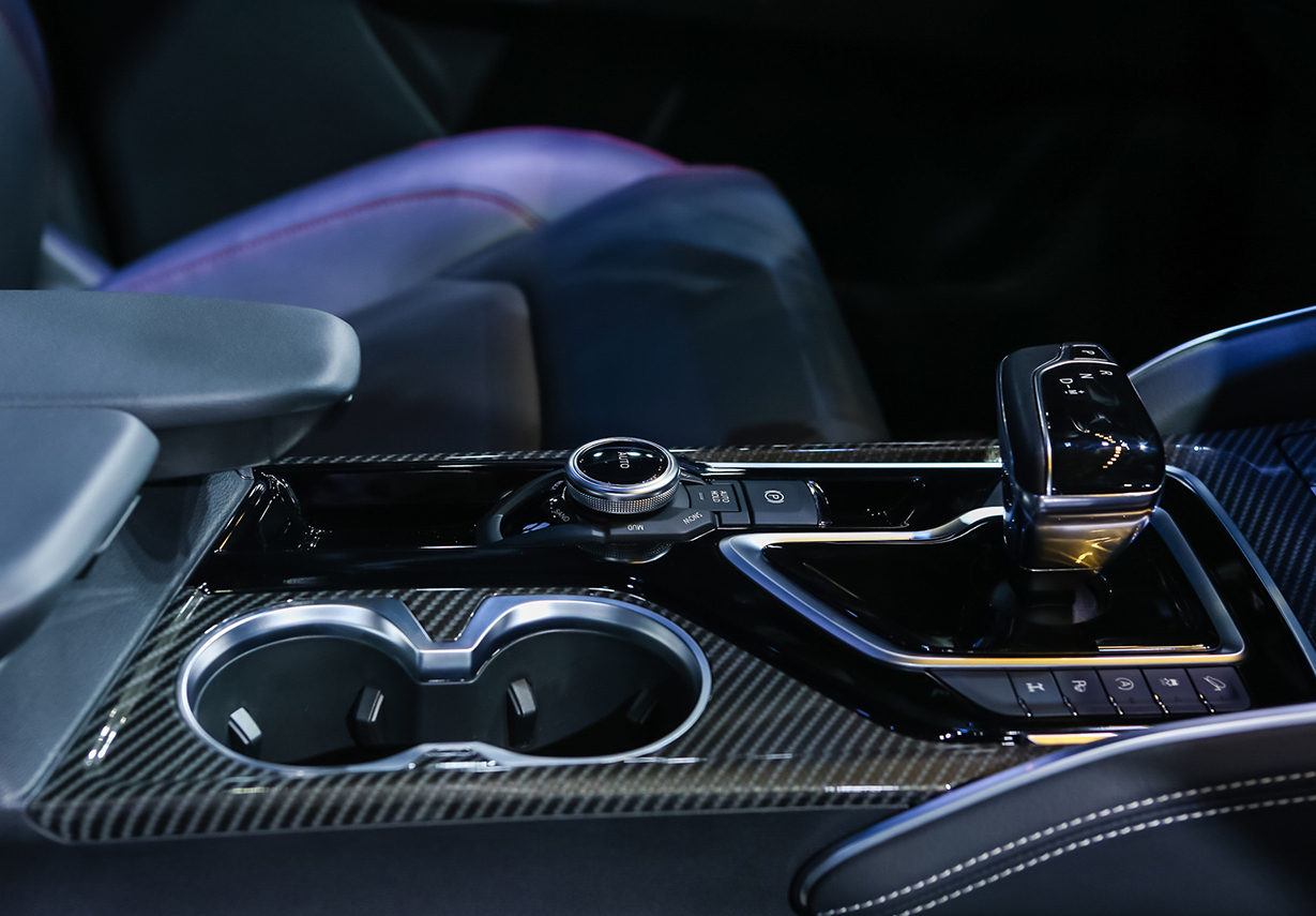 充溢着硬派风格。中央通道提供碳纤花纹饰板,座椅加入红色饰条和红色缝线,营造出极强的运动氛围,简约不乏质感。