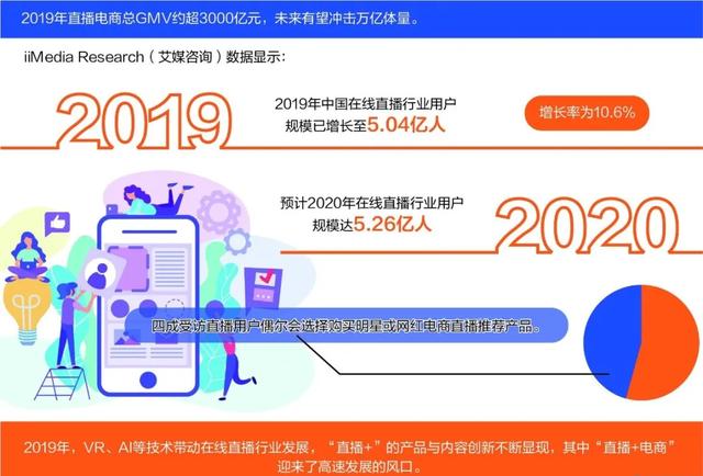 iiMedia Research(艾媒咨询)数据显示,2019年中国在线直播行业用户规模已增长至5.04亿人,增长率为10.6%,预计2020年在线直播行业用户规模达5.26亿人。四成受访直播用户偶尔会选择购买明星或网红电商直播推荐产品。2019年,VR、AI等技术带动在线直播行业发展,“直播+”的产品与内容创新不断显现,其中“直播+电商”迎来了高速发展的风口。