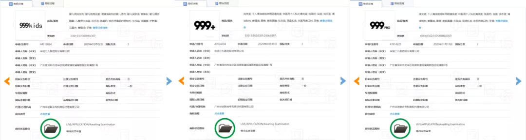 而中国商标网信息显示,华润三九在今年1月19日至3月2日期间先后申请了“999 pro”“999+”和“999KIDS”的3类(化妆品类)商标注册,以及包括消毒剂、护肤药剂、细菌抑制剂、抗菌洗手液等在内的5类(医药用品类)商标。