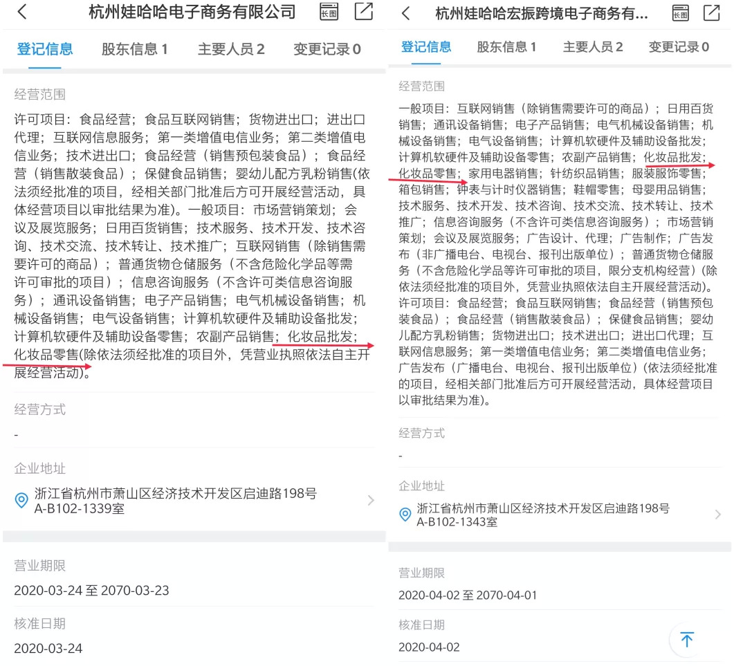 无独有偶,企查查信息显示,娃哈哈商业股份有限公司分别于3月24日、4月2日投资成了杭州娃哈哈电子商务有限公司及杭州娃哈哈宏振跨境电子商务有限公司,由娃哈哈品牌创始人、娃哈哈集团董事长宗庆后担任法定代表人、执行董事兼总经理。值得注意的是,上述两家新电商公司的经营范围均包含了化妆品批发、零售业务。