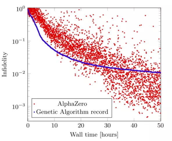 图2.遗传算法和AlphaZero在50小时运行期间的比较。在y轴上绘制了infidelity (1-F),这实际上是一个错误率