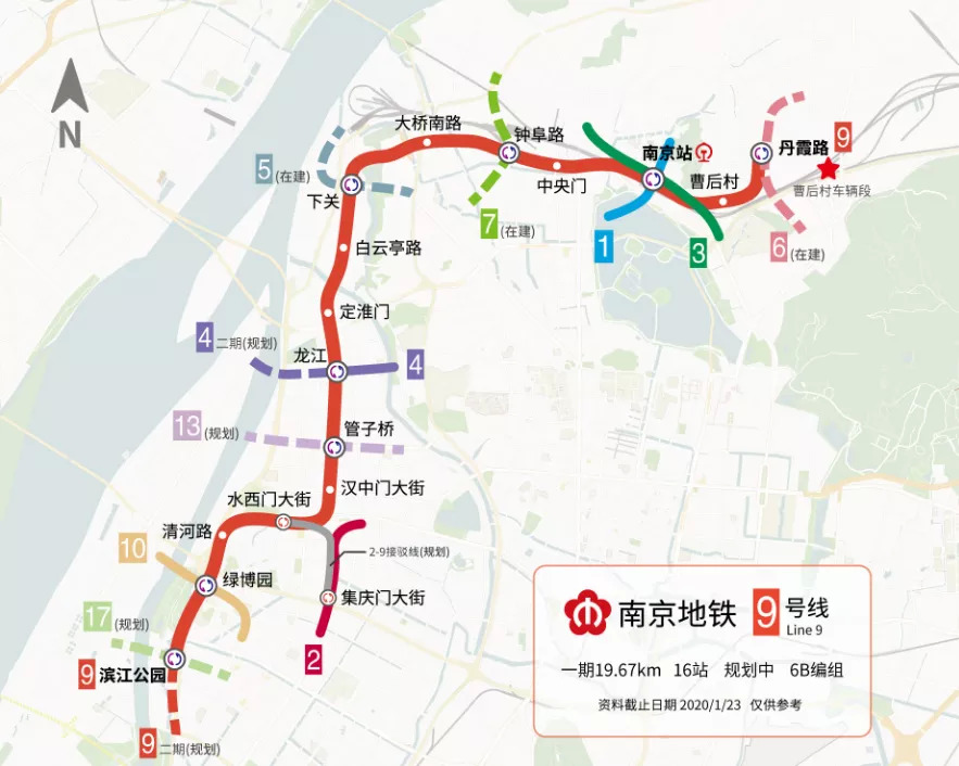 南京地铁9号线是南京地铁线网中一条“Γ”形走向的线路,计划于2023年通车。一期工程全长19.67千米,全部为地下线;共设置16座车站,全部为地下车站,采用B型列车6节编组。