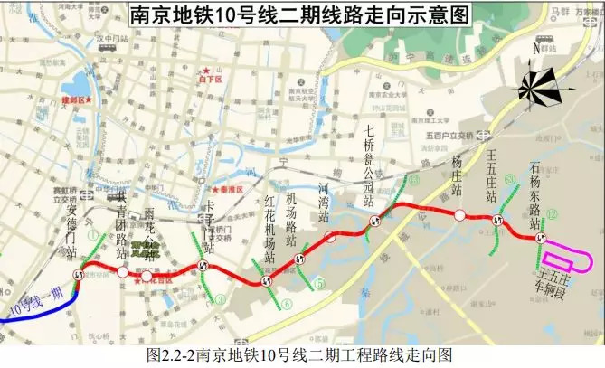 地铁10号线二期线路起于安德门站,出站后线路主要沿雨花西路、雨花南路、明匙路、原大校场机场跑道北侧绿化带、纬七路、石杨路、石杨东路敷设,终至石杨东路站。途经秦淮区、雨花台区、江宁区3个行政区。