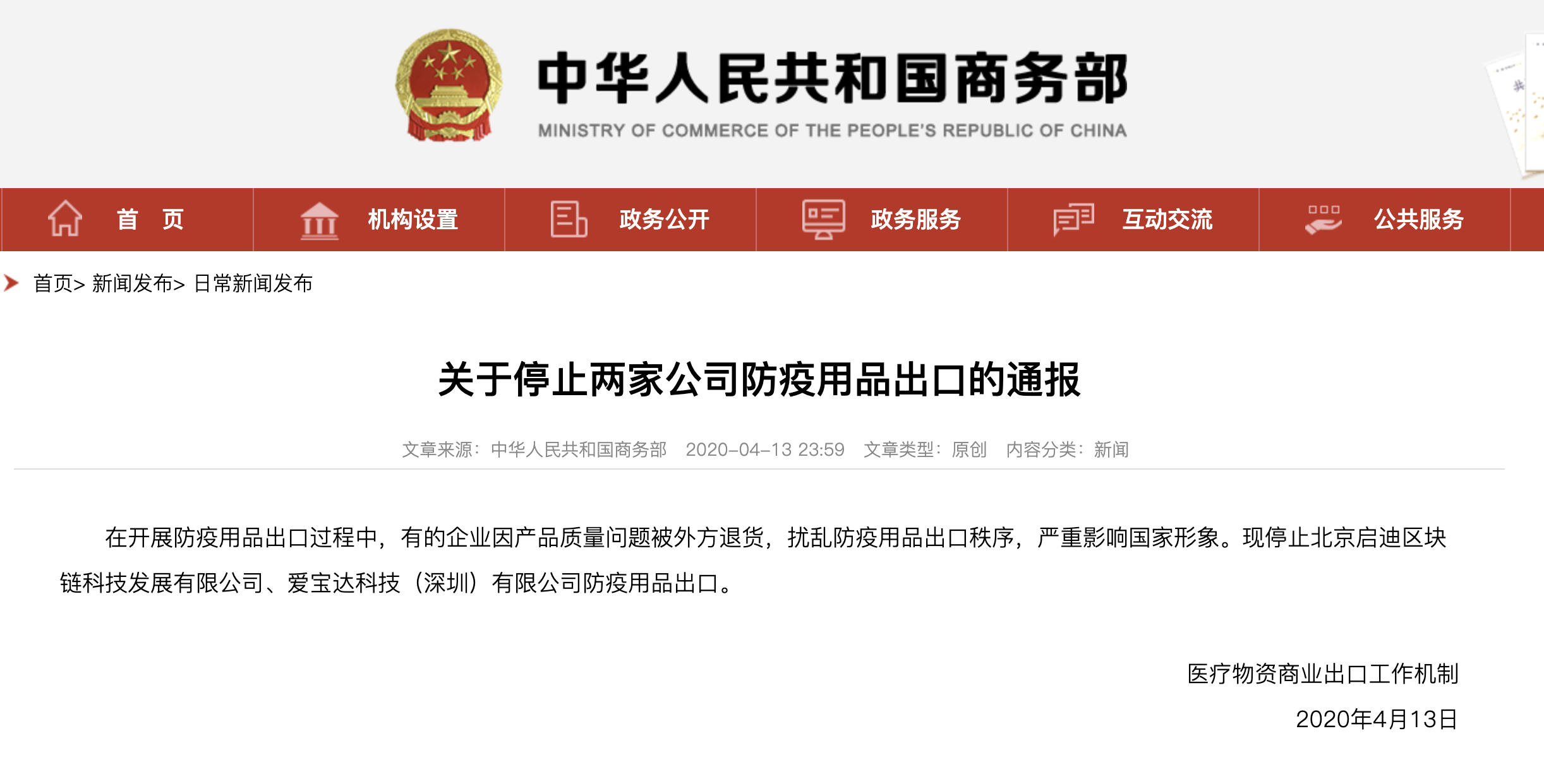 4月13日,商务部在一则通报中点名批评了两家进行防疫用品出口的中国企业:北京启迪区块链科技发展有限公司与爱宝达科技(深圳)有限公司,并且停止了两家公司的防疫用品出口。