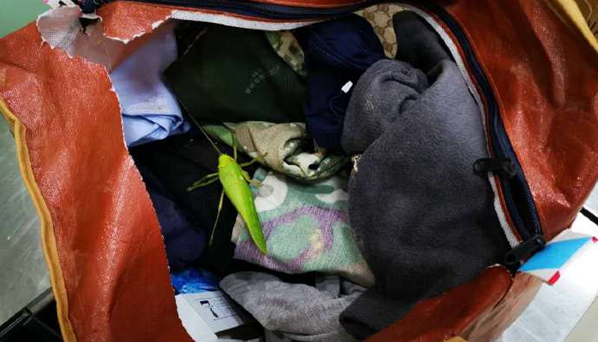 据海关总署办公厅微博消息,4月14日,昆明海关所属勐腊海关首次在入境旅客携带物中截获活体昆虫巨拟叶螽。据悉,现场关员在对一名中国籍旅客进行行李查验时,发现其包内携带一只活体昆虫——巨拟叶螽,为该关首次截获,目前已将该昆虫做送检销毁处理。