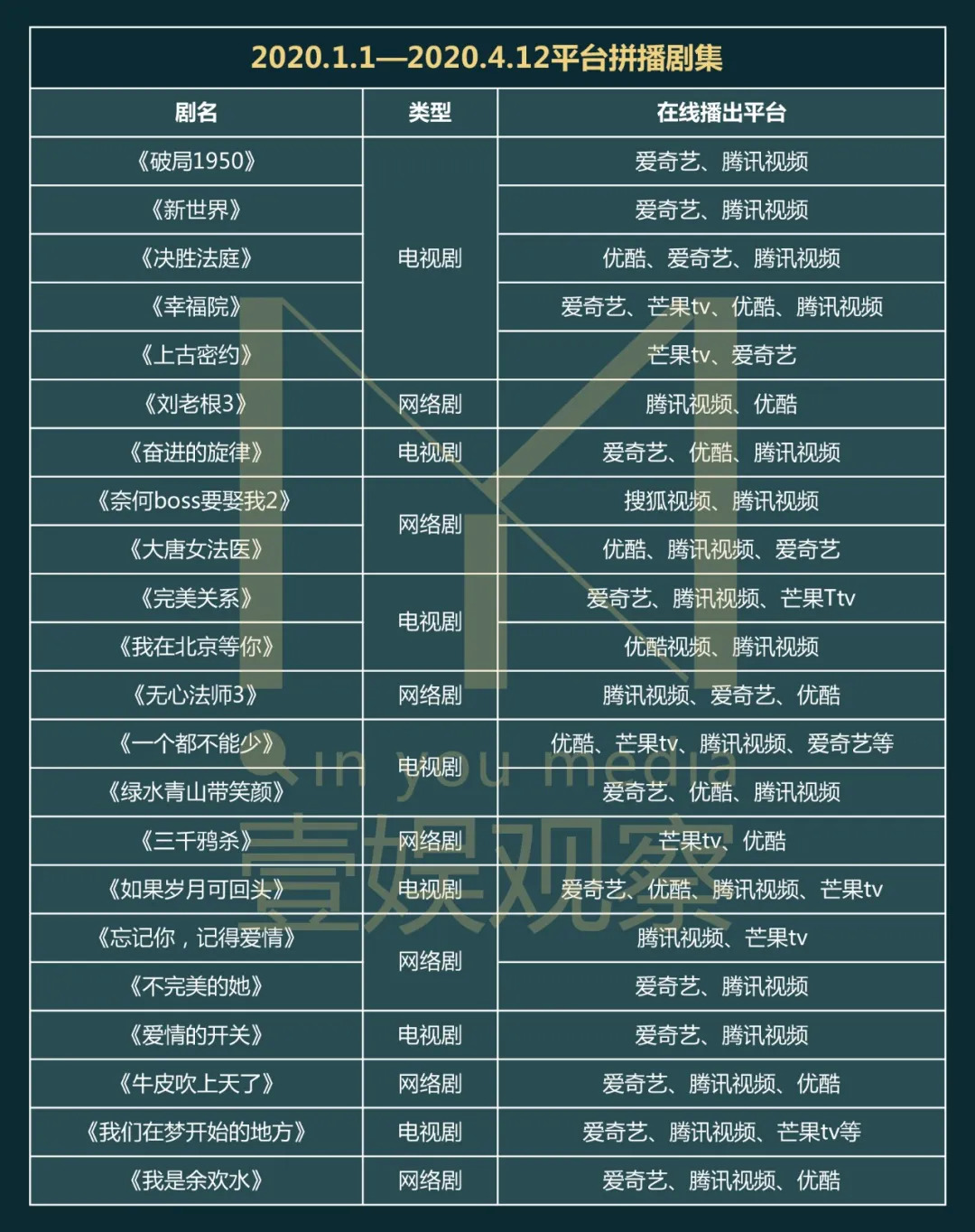 但与此同时,平台拼播情况也出现了一些趋势。首先是多家平台拼播数量在拼播剧集中占比最高。壹娱观察(ID:yiyuguancha)总结了1月1日—4月12日平台拼播的共23部剧集,发现优爱腾三家或以上平台拼播数量最多,为12部,占比超过50%,并且多以电视剧为主,这也符合电视剧常采用的全网播出的方式。