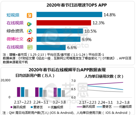 与此同时,腾讯视频的日活增速明显。根据艺恩发布的《2020年Q1在线视频内容市场研究报告》显示,春节期间,腾讯视频以12.3%的增幅成为日活增速最高的在线视频平台,并在春节后持续保持平台数据领先。快速增长的日活,或许会为腾讯视频追赶爱奇艺的渠道占比贡献一份力。