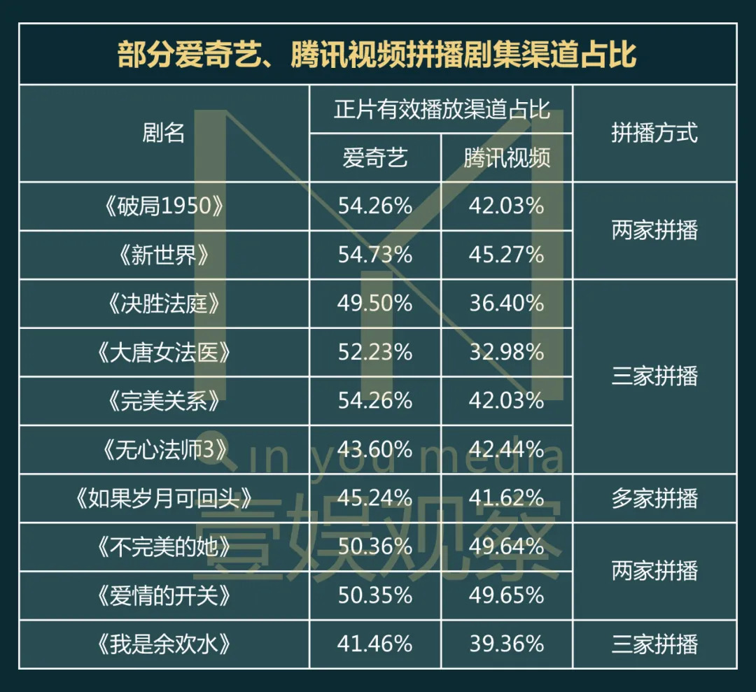 同时,腾讯视频拼播数量最多,为20部,去除掉上述多家平台拼播剧集数量,腾讯视频与其他一家平台两两拼播的也有8部,而在这其中又以与爱奇艺拼播的数量最多。二者拼播的项目既有如《新世界》这样的头部电视剧,也有由企鹅影视担任出品公司之一的网剧《不完美的她》。