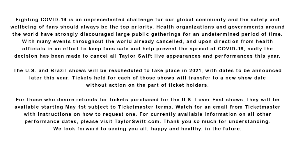 4月18日,据CNN报道,泰勒·斯威夫特在社交网络发布声明,宣布取消2020年的所有演出活动,已经购票的观众可兑换明年的演出票。泰勒表示:“我很难过今年不能和粉丝们在演唱会见面,但我知道这是正确的选择,请保证自己的健康与安全,我们很快将会在舞台见面。”