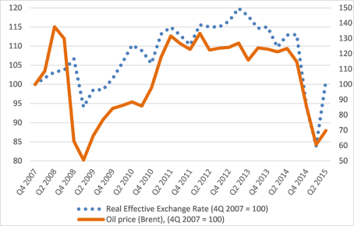 在俄罗斯弹性汇率制度下,其主要出口商品(石油和天然气)规模的下降很快就导致了卢布贬值。由于2014年末,石油价格减半至每桶60美元左右,卢布也随之等幅度贬值。这种实际汇率的迅速贬值又导致了进口总量急剧缩减。俄罗斯的公司和家庭根本无力支付价格日益上升的外国商品和服务。到目前为止,这种情况带来了俄罗斯经济的严重衰退,俄罗斯人民不得不削减消费,而这又进一步使更多俄罗斯人陷入了很不稳定的环境中。