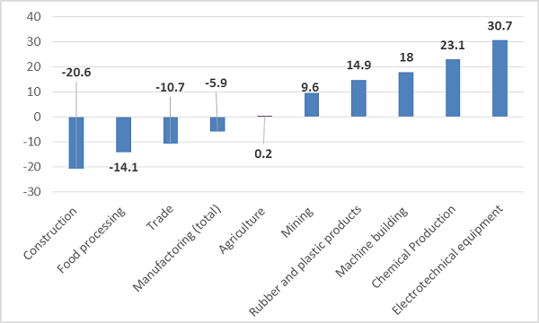 对一些制造商来说,要充分利用卢布贬值的优势,还需要更多投资。一些拥有较高质量标准的公司似乎已经受益于卢布贬值,而其他一些公司的竞争力则还有待提高。要改变产品模式、全面实现国际化质量标准的生产,还需要更多时间和投资。不过,这个过程似乎已经开始了。俄罗斯部分行业的投资已经进入稳定增长阶段,尤其是在化工、橡胶、塑料、电子和机器设计制造行业。(如下图)