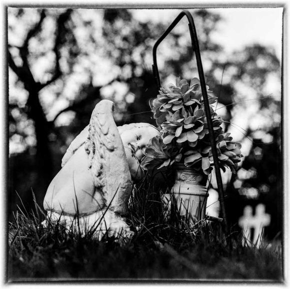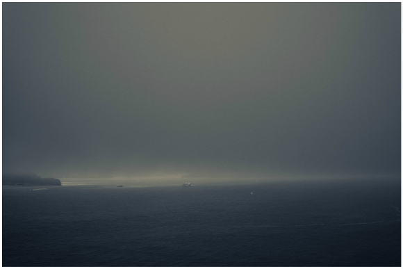 但又不仅如此。在“创伤的序列”中有一组叫做“乐园”(Playgrounds)的照片,在他的镜头下,墓地成了小天使与玩具的乐园,生命与死亡仿佛皆脱离了沉重,在黑白两色的静谧中变得轻盈、明亮、美好。而另一组照片“海湾”(At Bay),拍摄的是晨曦中的透过重雾显现身影的远山、岛屿、船只。在深蓝色的阴影中,“光在逐渐向你打开,逐渐展示一些新的可能性。”