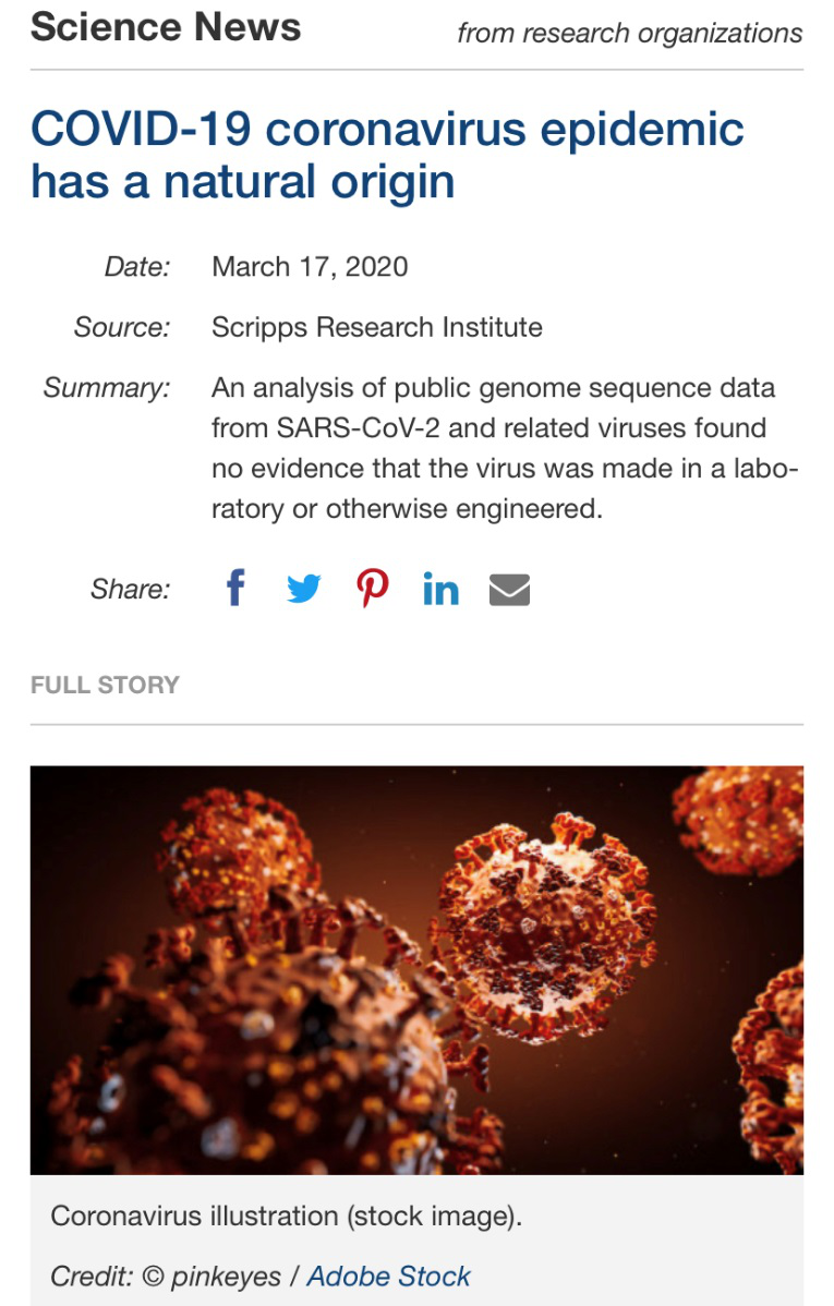 △美国《科学日报》撰文《COVID-19病毒的自然起源》