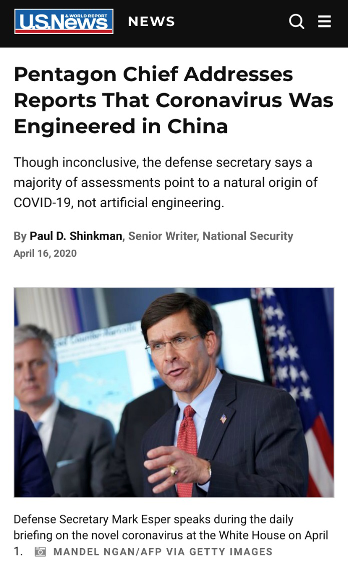 此外,《美国新闻周刊》报道,美国国防部长表示,尽管研究尚无定论,但多数评估都指向COVID-19的自然起源,而不是人工合成。