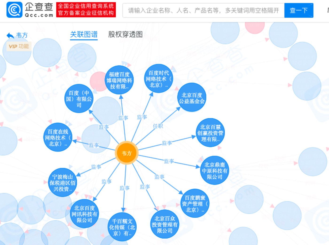 4月21日,天眼查提供的数据则显示,韦方在包括北京百慧创赢投资管理有限公司、北京百众投资管理有限公司、百度(中国)有限公司等在内的15家百度相关企业担任监事等职务。此外,共有两条股权出质信息,质权人均为北京小度信息科技有限公司,出质股权数额198万元。