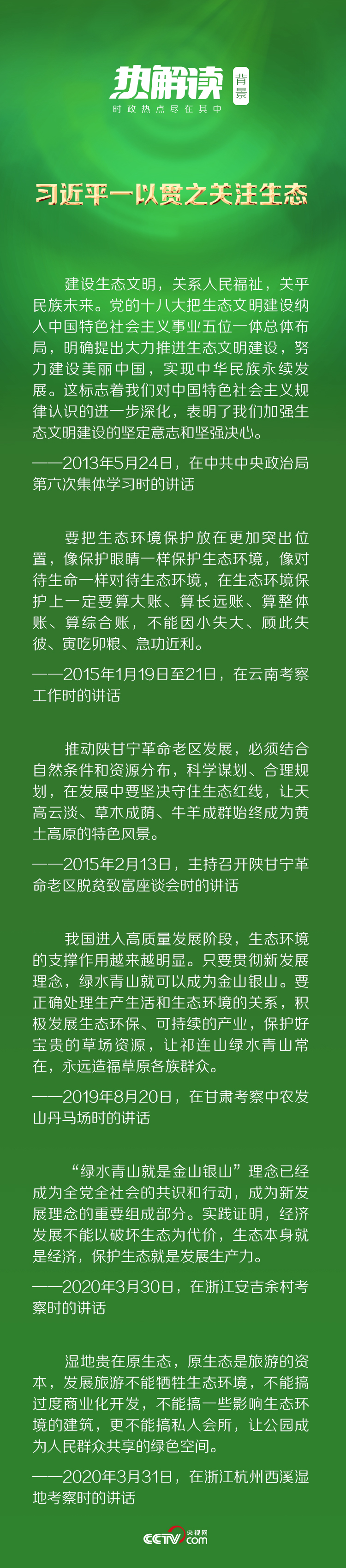 对生态建设,习近平慎终如始,一发现问题,就扭住不放,一抓到底;解决问题之后,还要“回头看”。今年春节前,习近平在云南察看滇池保护治理情况,2019年8月在甘肃祁连山下的山丹马场,听取祁连山生态修复情况介绍,都是“回头看”的印证。