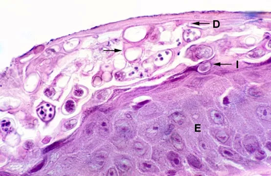 两栖动物皮肤上的角蛋白是壶菌的营养来源。当感染两栖类后,壶菌会分布在爪蟾角质化皮肤上。