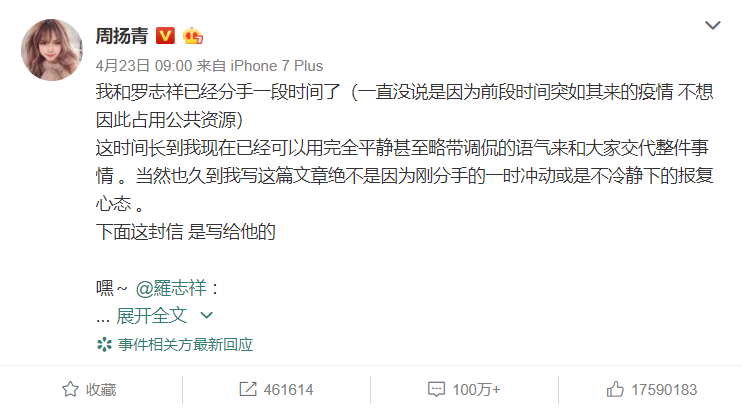 4月23日本是世界读书日,结果大家忙着吃瓜。罗志祥相恋9年的女友周扬青发长文手撕罗志祥,引发了全民热议。